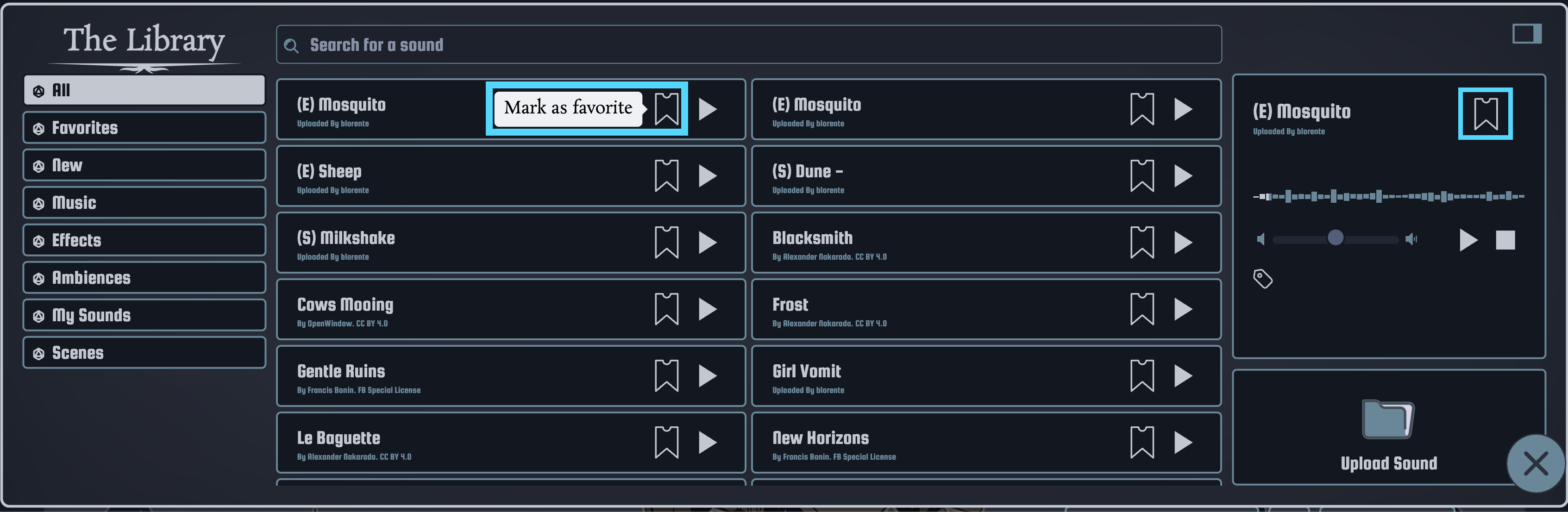 The simplest way to customize your Library is to mark sounds as favorites. If you find yourself searching for a sound again and again, you can click the banner icon to mark it as a favorite: